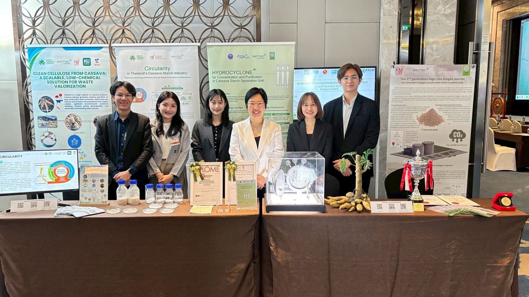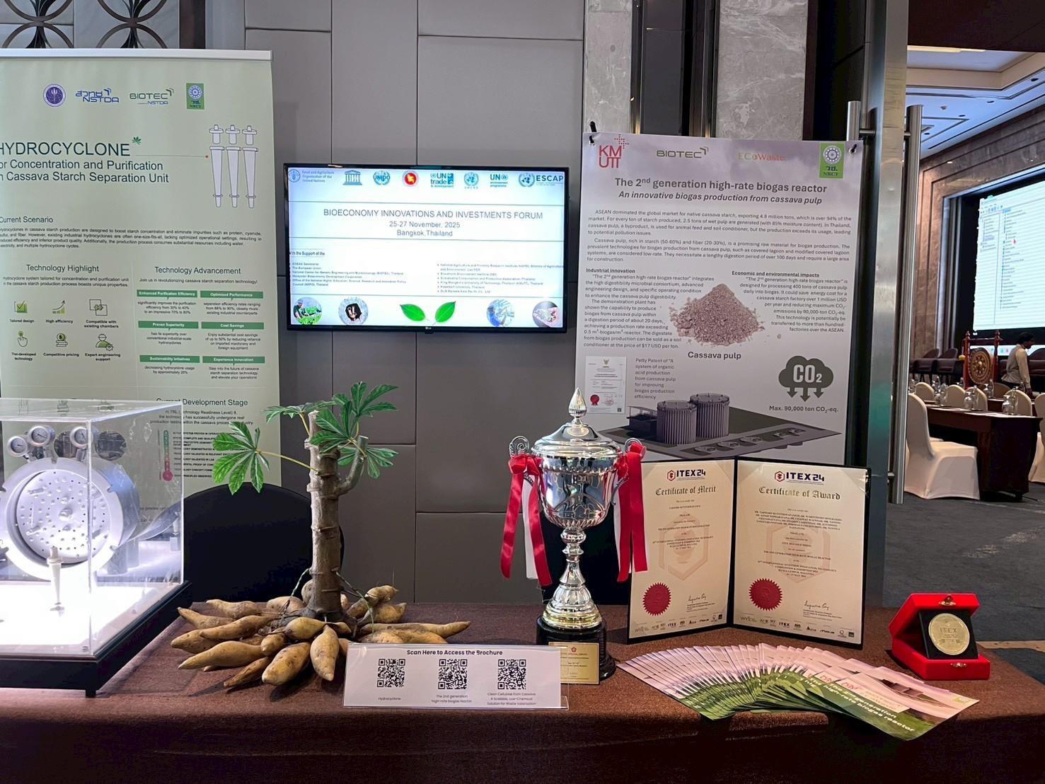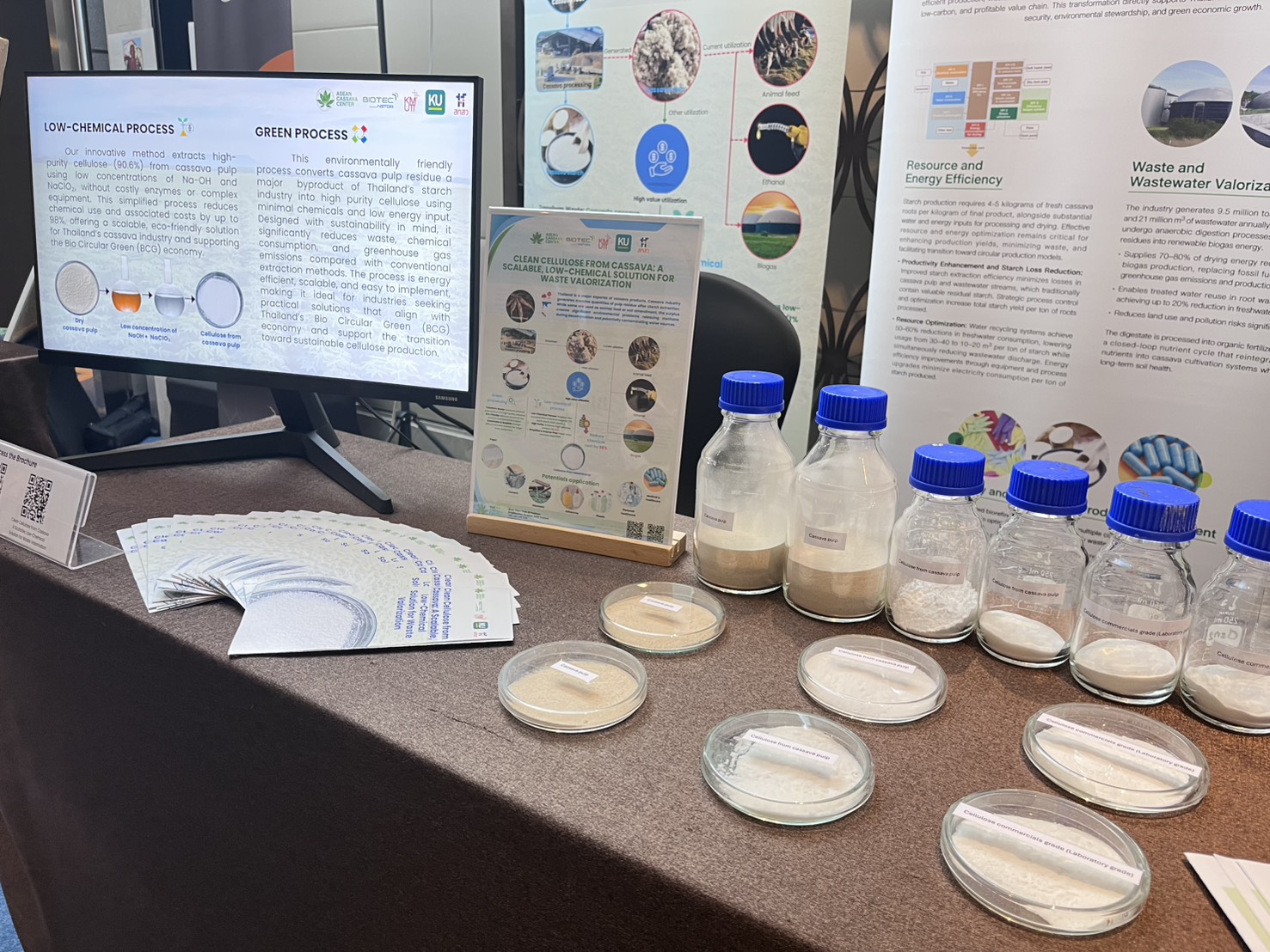 As part of the exhibition, the ASEAN Cassava Centre led by the National Center for Genetic Engineering and Biotechnology (BIOTEC), under the National Science and Technology Development Agency (NSTDA), and King Mongkut’s University of Technology Thonburi (KMUTT) is showcasing three flagship innovations that demonstrate how scientific research and technological development can uplift the entire cassava value chain. These innovations address critical challenges in waste management, resource loss, industrial inefficiency, and environmental sustainability.